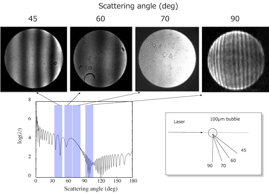 これをみると,前方30-80度付近に規則的な強度変動(干渉縞)が現れ,これが粒径に依存することがわかります.
