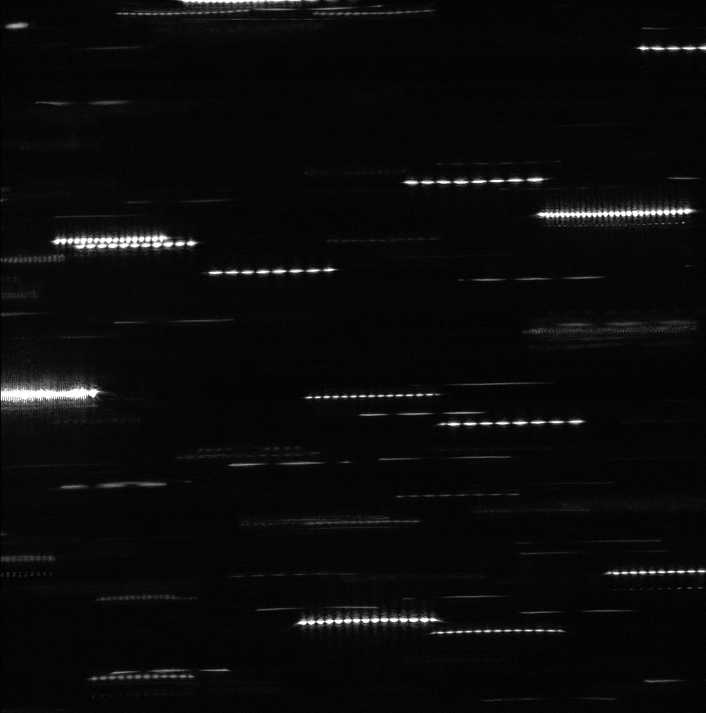 厚いレーザシートの場合.数フレームにわたり,それぞれの粒子像が確認できる.